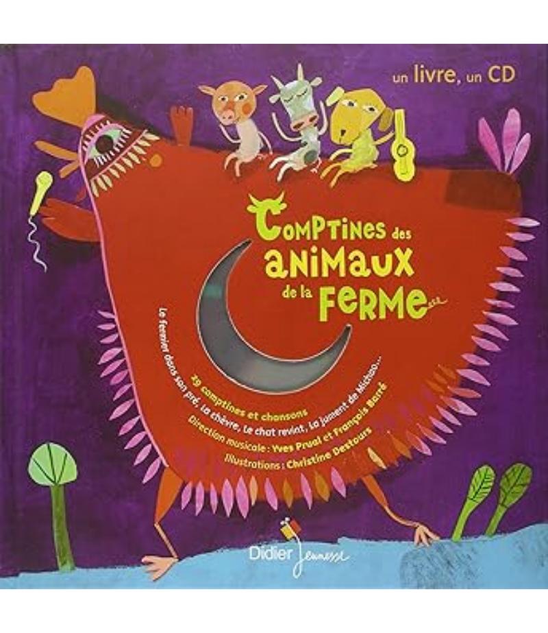 Comptines tombées dans l’oubli, chansons contemporaines inédites et pleines d’humour, chanson d’auteurs (Henri Dès, Julos Beaucarne…), formulettes du flolklore enfantin… voici réunies par Yves Prual, 29 comptines autour des animaux de la basse-cour. Un dosage tonique et très original qui devrait réjouir toute la famille! Christine Destours répond à ce folklore avec des créations très colorées et décoiffantes. Voici la ferme et ses animaux revisités avec bonne humeur!